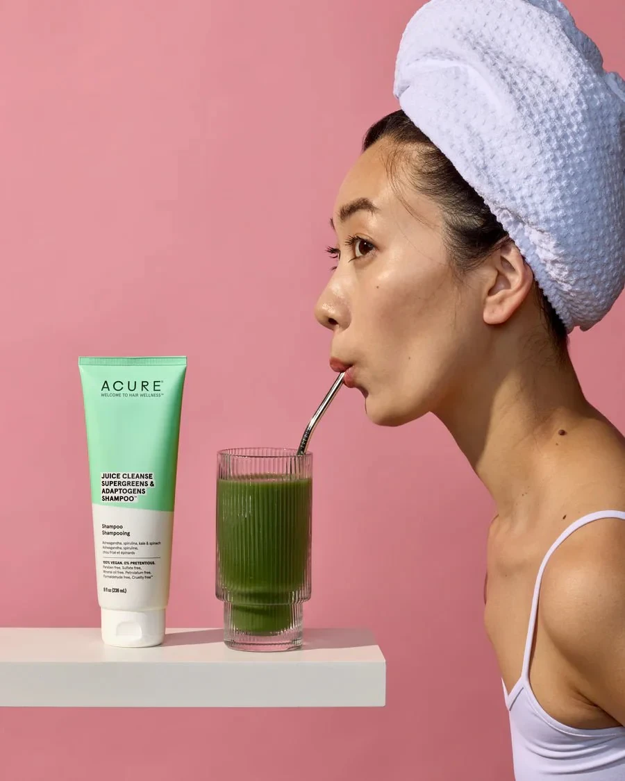 Skin CompatibilityThis shampoo is suitable for all skin and scalp types, including normal, dry, and sensitive scalps. Its gentle, plant-based formula makes it safe for daily use. Refresh your hair with the power of greens! The Acure Juice Cleanse Supergreens & Adaptogens Shampoo is like a nutrient-packed smoothie for your scalp and strands. Infused with superfoods and adaptogens, it delivers a burst of vitality and balance, leaving hair feeling fresh, strong, and naturally healthy. Benefits