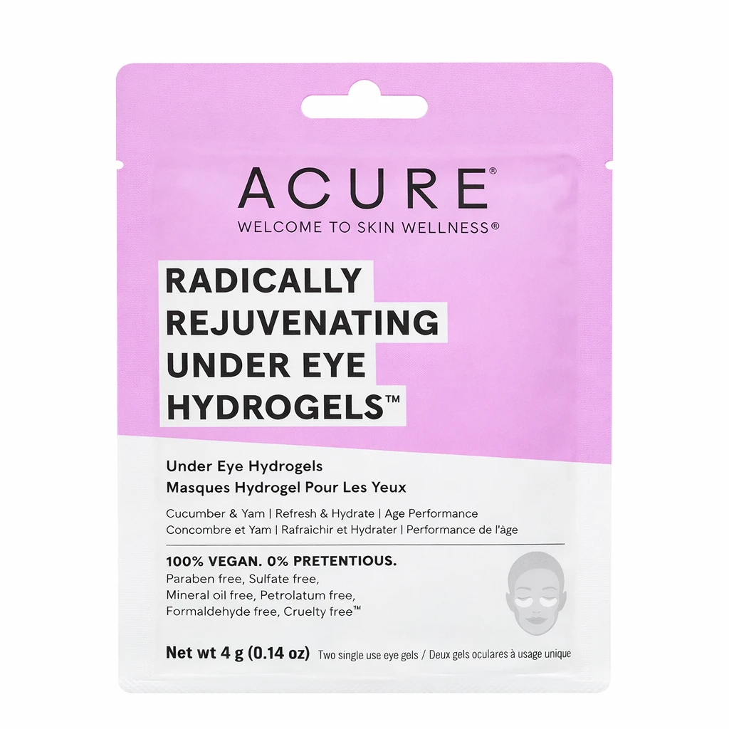 Acure Radically Rejuvenating Under Eye Hydrogels Mask with Cucumber & Yam is a refreshing eye treatment designed to hydrate, soothe, and revitalize the delicate under-eye area. These cooling hydrogel patches help reduce signs of fatigue while delivering moisture and nutrients to improve the appearance of puffiness, dryness, and dullness. Perfect for tired eyes, leaving the under-eye area looking smoother, brighter, and refreshed. Key Benefits