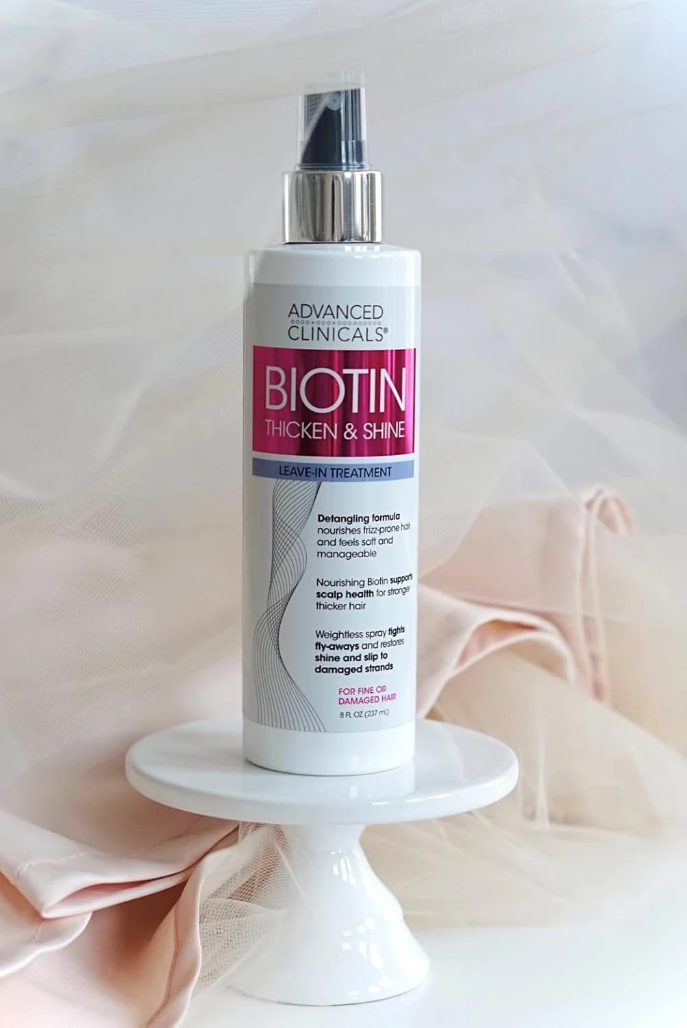 Suitable for Any Hair TypeFormulated for fine, thinning, weak, or damaged hair, but can be used on all hair types needing extra strength and volume. "Give your hair a boost of strength and volume with Advanced Clinicals Biotin Thickening & Strengthening Leave-In Treatment. Enriched with nourishing biotin, keratin, and botanical extracts, this lightweight formula fortifies each strand, reduces breakage, and promotes thicker, fuller-looking hair. Perfect for restoring vitality to weak, thinning, or color-treated hair." Benefits