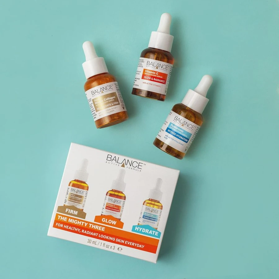Balance Active Formula presents The Mighty Three, a powerful skincare trio designed to target key skin concerns with concentrated active ingredients. This set includes three essential serums—Vitamin C, Niacinamide, and Hyaluronic Acid—working together to brighten, hydrate, and balance your skin. Ideal for creating a simple yet effective skincare routine, this set helps achieve radiant, smooth, and healthy-looking skin every day. What's Included: