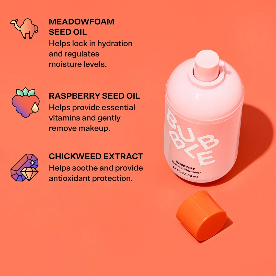 Say goodbye to stubborn makeup in just one swipe The Bubble Wipe Out Makeup Remover effortlessly dissolves even long-lasting makeup while keeping your skin soft, refreshed, and nourished. A clean start for your skincare routine, every single time! Benefits: