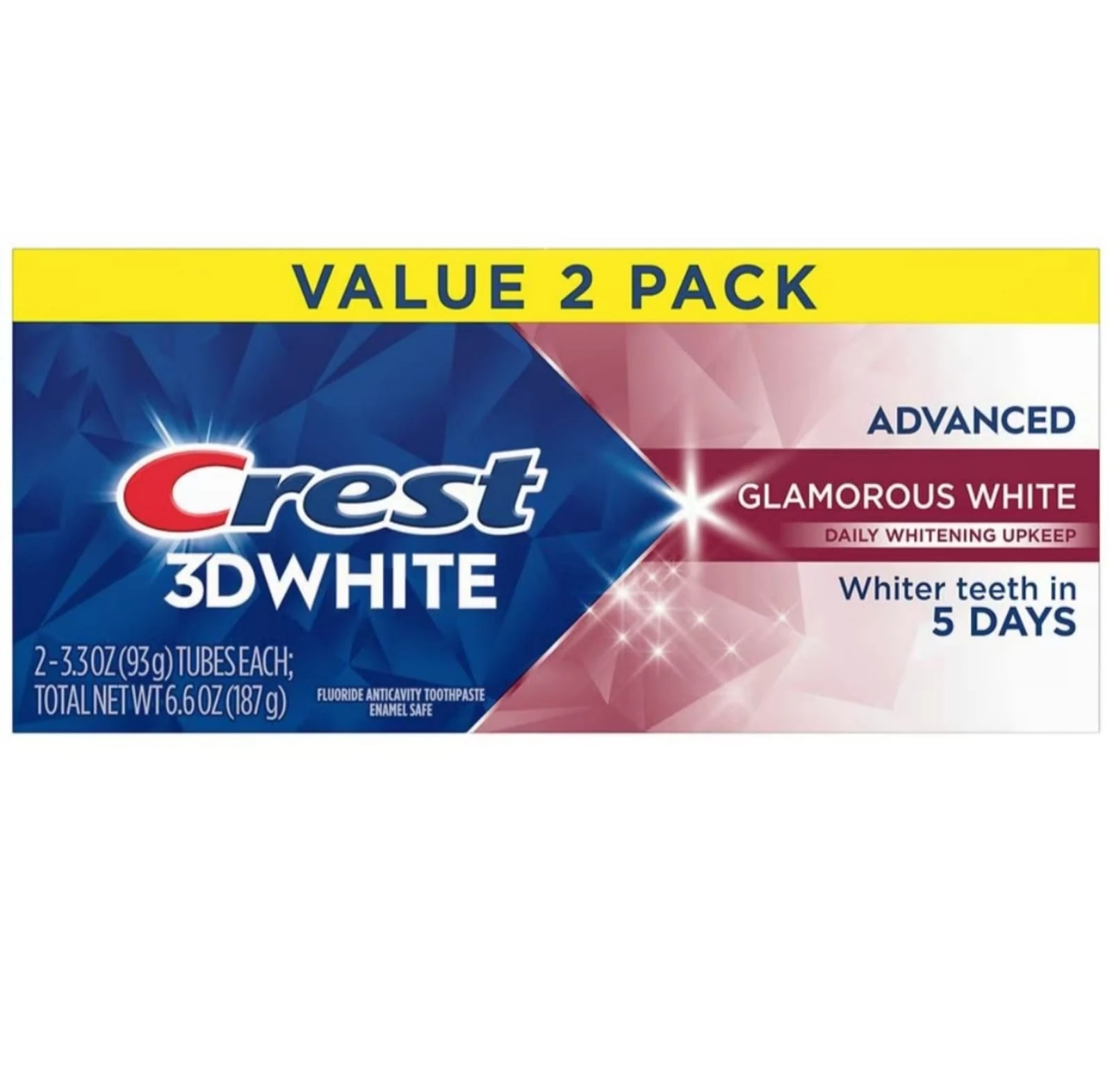 Reveal a dazzling smile with Crest 3D White Glamorous White Toothpaste. Designed for daily whitening upkeep, this advanced formula removes up to 90% of surface stains in just 5 days, giving you visibly whiter teeth with every brush. With a refreshing minty flavor and enamel-safe ingredients, it's your go-to solution for a glamorous, confident smile—day after day. Key Features:Removes up to 90% of surface stains in just 5 days Enamel-safe fluoride formula for daily use Fights cavities and strengthens tooth enamel Leaves breath fresh and mouth feeling clean Comes in a value 2 pack (2 x 3.3 oz / 93g tubes) How to Use:Apply a pea-sized amount of toothpaste onto your toothbrush. Brush teeth thoroughly for at least 2 minutes, twice a day (morning and night), or as recommended by a dentist. Spit out after brushing. For best whitening results, avoid food and drink for 30 minutes after brushing. Warnings:Do not swallow. This product is for oral use only. Keep out of reach of children under 6 years. In case of accidental ingestion, get medical help or contact a Poison Control Center right away. If irritation occurs, stop use and consult a dentist. Store in a cool, dry place and replace the cap after use. |