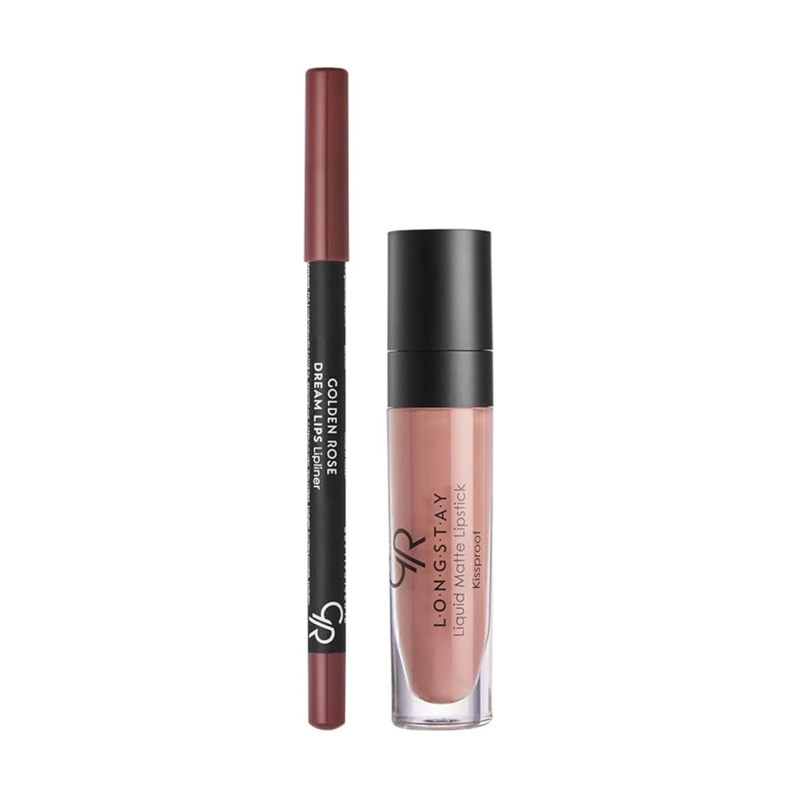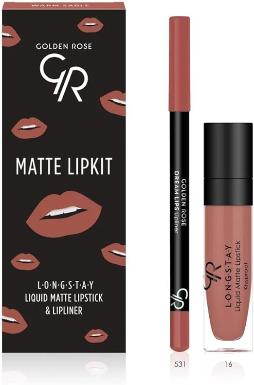 - Achieve the perfect pout with the Golden Rose Matte LipKit, a luxurious duo that combines a long-lasting Liquid Matte Lipstick with a matching Lipliner. This kit ensures bold, smudge-proof color and precise definition in one easy set. The highly pigmented lipstick delivers a flawless matte finish, while the creamy lipliner prevents feathering and boosts wear time. Ideal for all-day glamour with no compromises.