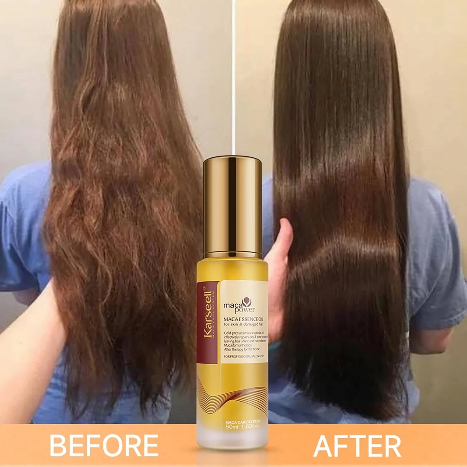 Suitable For All Hair TypesDesigned especially for damaged, dry, chemically-treated, or heat-styled hair, this fast-absorbing oil also suits all hair types, aiming to restore shine, elasticity, and manageability . “Karseell Maca Oil is a luxurious, nutrient-rich elixir fortified with Moroccan argan, shea, and avocado oils. It penetrates deeply to nourish and repair hair fibers, tame frizz, protect from up to 230 °C heat, and deliver instant shine and silky smoothness—without weighing hair down.” Key Benefits