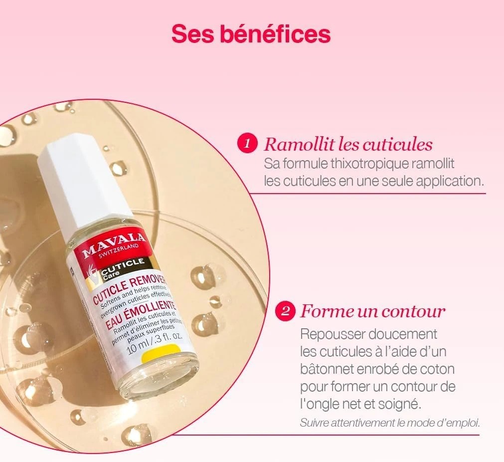 Suitable for Any Nail TypeThis cuticle remover is suitable for all nail types, designed to safely soften and remove overgrown cuticles for a neat, well-groomed look. Achieve salon-quality manicures at home with Mavala Cuticle Remover, a Swiss-made solution that gently softens and loosens overgrown cuticles. Its quick-action formula allows effortless removal without damaging the nail or surrounding skin. By creating a clean, defined nail contour, it enhances nail health and appearance, making your nails look polished and elegant. Key Benefits