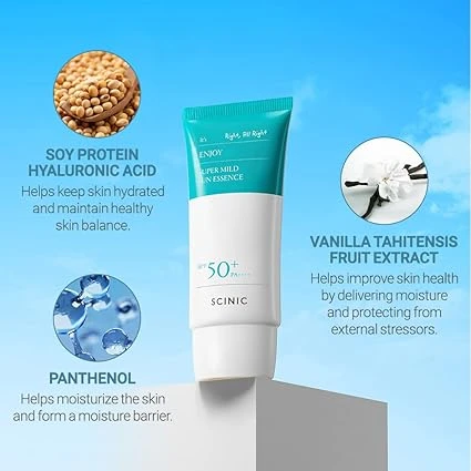 The SCINIC Enjoy Super Mild Sun Essence is a Glowpick Award-winning sunscreen that combines high UV protection (SPF 50+ PA++++) with deep hydration. Its essence-like texture glides smoothly on the skin, absorbing quickly without leaving a white cast or stickiness. With 8 hours of lasting moisture, it doubles as a makeup-friendly base, keeping skin fresh, protected, and glowing all day long. Benefits