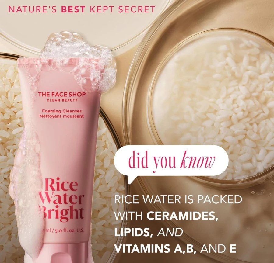 Gentle Foaming Cleanser with Rice Water and Ceramides Elevate your skincare routine with The Face Shop Rice Water Bright Foaming Facial Cleanser — a rich, creamy foam infused with nourishing rice water extract and protective ceramides. Known for its brightening and moisturizing properties, this gentle cleanser effectively removes impurities, excess oil, and makeup residue without stripping the skin’s natural moisture barrier. Benefits:
